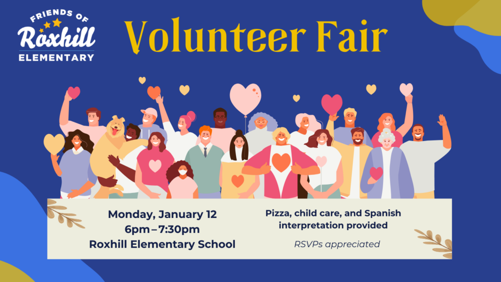 The start of the year is a perfect time to try something new and get more involved at Roxhill. We know it can be hard to know where to start, which is why you’re invited to the January Roxhill Volunteer Fair! Pizza, Spanish interpretation, and childcare provided!